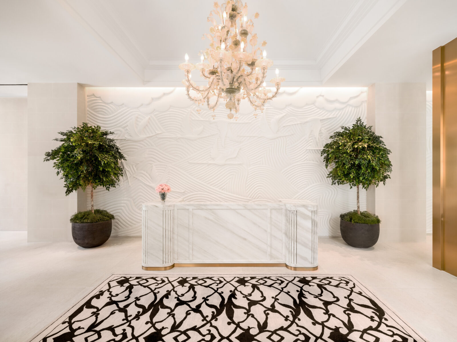 The sculptural bar is covered in ivory and gold mosaic featuring leaf shapes and light oak and other wood tones are illuminated by a Murano glass table lamp from the owner’s personal collection. The sweeping shape of the bar lends drama and provides a focus for this space. A custom-gilded bird design graces the glowing ceiling.