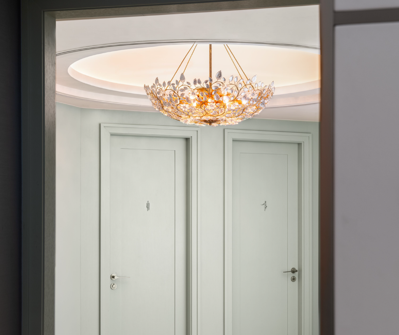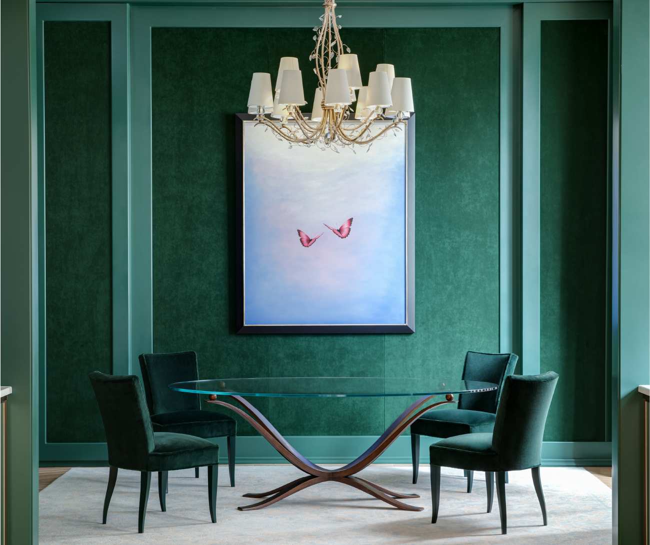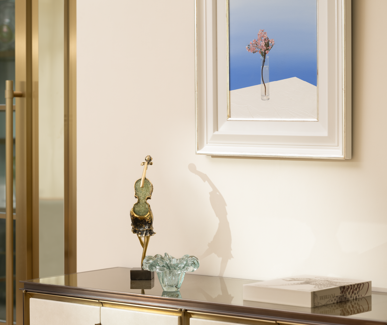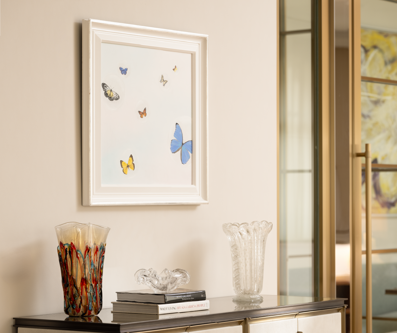 This auction piece is from a palace in France, reflecting the grandeur and elegance of 18th-century style. Here, modernity meets sophistication, with a resplendent Murano glass chandelier and an exquisite painting that commands attention.