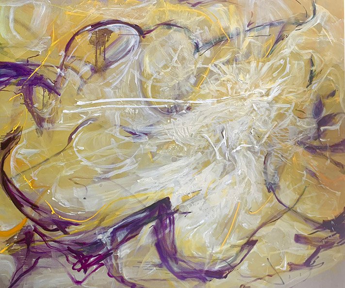 Created during the artist’s stay in Hong Kong in 2023, this piece is inspired by Hong Kong’s dazzling energy. The work poignantly captures theexhilarating pace of Hong Kong, the city’s flurry of lights and the luminosity of its skyline against a dark purple horizon. The artist has said that the inspiration behind this work is the sensation of bright city lights flashing by when looking out the window of a minibus dashing through Hong Kong’s dizzying traffic. It captures the spirit of Hong Kong: a sea of lights, a concrete jungle, a city that never sleeps.