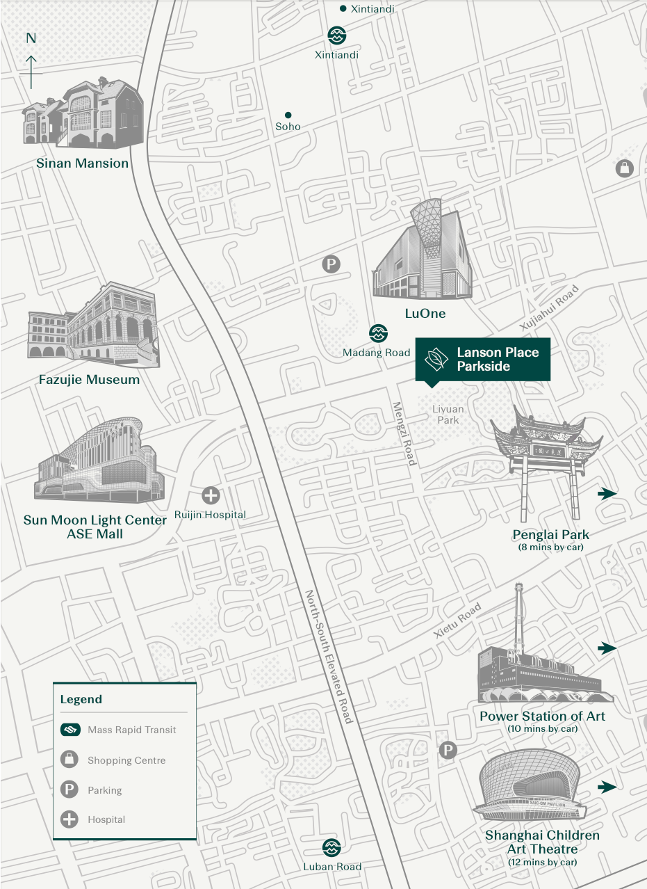 Located in the quiet and upscale neighbourhood of Huangpu District, Shanghai, Lanson Place Parkside is easily connected to other parts of the city with the adjacent Madang Road metro station. Spend a relaxing afternoon exploring the area’s hip cafes and strolling through local boutiques. Find international brands and restaurants at shopping and entertainment hubs like LuOne Shopping mall and Xintiandi.